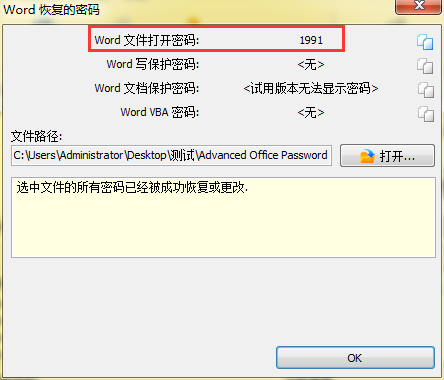 虽然Advanced Office Password Recovery软件十分专业,但是使用起来还是十分方便的,如果不是十分复杂的密码,只需要用户打开要破解密码的Word文档,“准备攻击”就可以恢复密码。如果密码较为复杂,准备攻击破解失败,用户需要选择Word密码破解工具“恢复”标签页中其他具有更强攻击力的攻击类型。等待Advanced Office Password Recovery的破解攻击运行5秒左右便弹出了以下结果对话框: