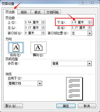 2、在“页边距”选项卡,把下页边距调小些。