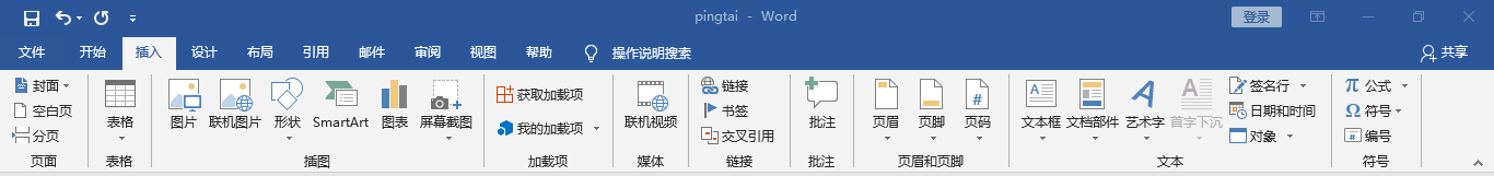 包括:“页面”、“表格”、“插图”、“加载项”、“媒体”、“链接”、“批注”、“页眉和页脚”、“文本”、“符号”几个大栏。