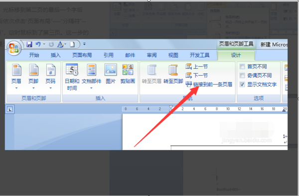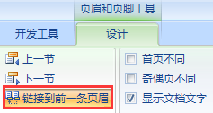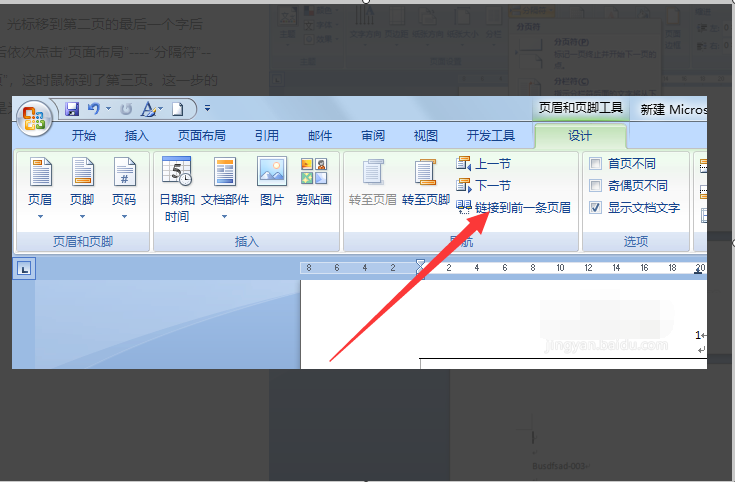 3.在页眉和页脚工具的设计选项下,勾掉“链接到前一条页眉”选项;