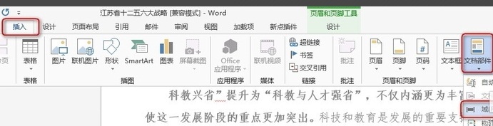 4第四步:将光标放在第和页字之间,在插入命令中找到文本-文档部件。