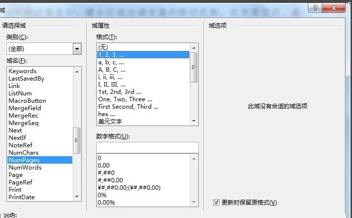 第六步:将光标放在共和页字之间,在插入命令中找到文本-文档部件。找到文档部件下面的域命令,在域名中找到numberpage命令,然后按确认,就会发现共字和页字之间出现总页数了。