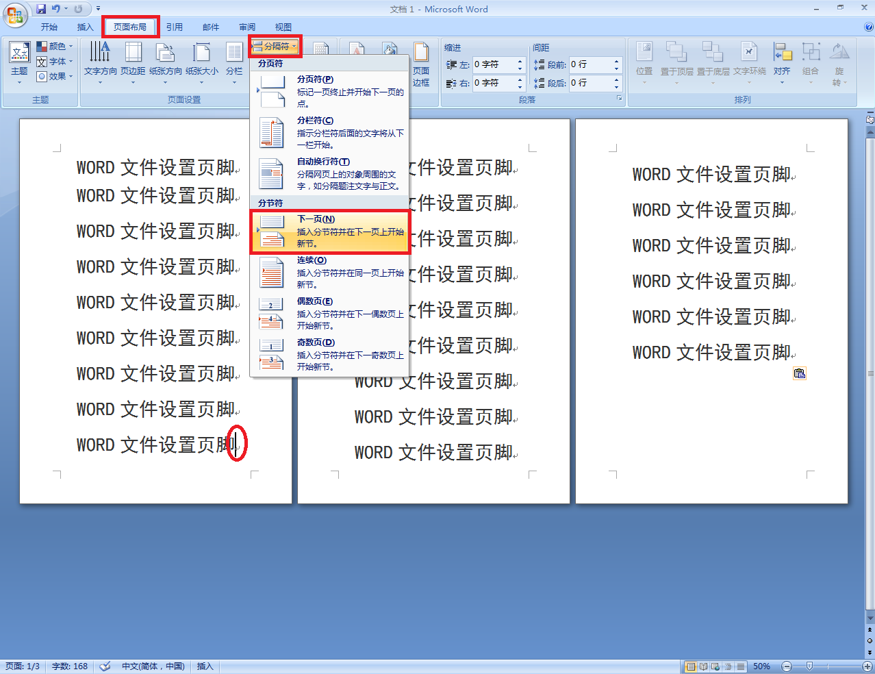 WORD中如何设置分页符,使文章插入不同的页眉页脚?