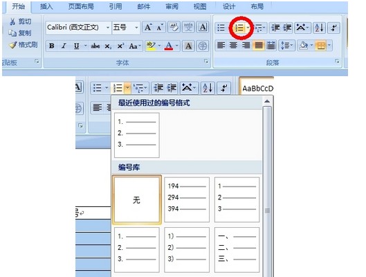 2、单击开始----编号按钮,在弹出的选项中选择一种编号格式,如1. 2. 3. ;