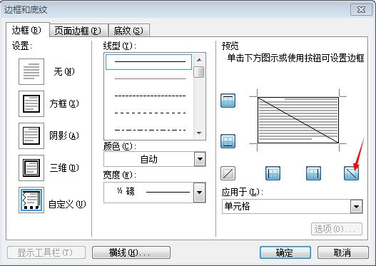 2.选中要画斜线的单元格——右击——〔边框和底纹〕——在右边预览框下面找到斜线按钮单击。