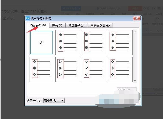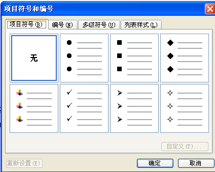3、弹出项目符号和编号窗口中我们先来观察项目符号的表现形式,如下图所示。