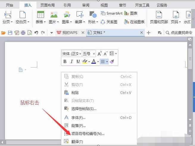 2、通过新建文档后,在空白页面鼠标右击选择项目符号和编号,如下图所示。