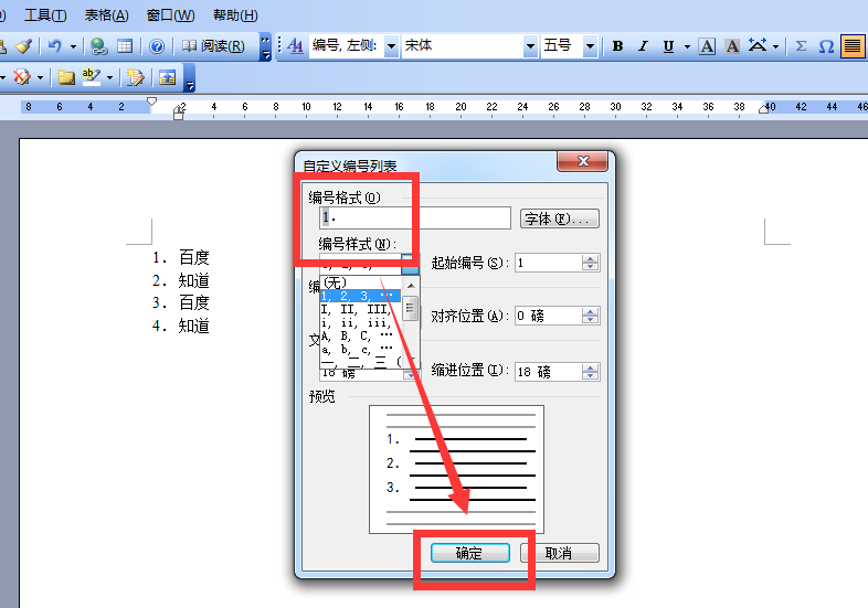 在打开的”自定义编号列表“界面上,根据实际需要来选择特定的”编号格式“、”编号样式“等等,点击”确定“;