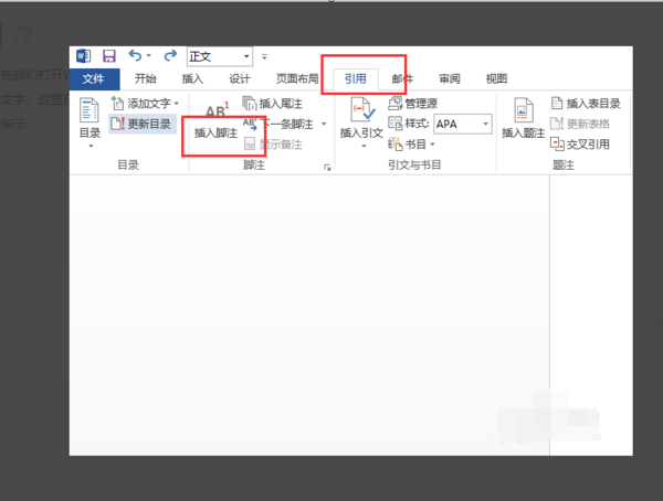 5、将光标定位在下一个要插入脚注的位置;单击“引用”选项卡;单击“脚注”组中的“脚注”按钮。