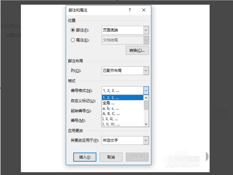 5、这个时候会弹出脚注和尾注的对话框界面,我们在格式中的编号下拉框选择自己想要的编号样式即可