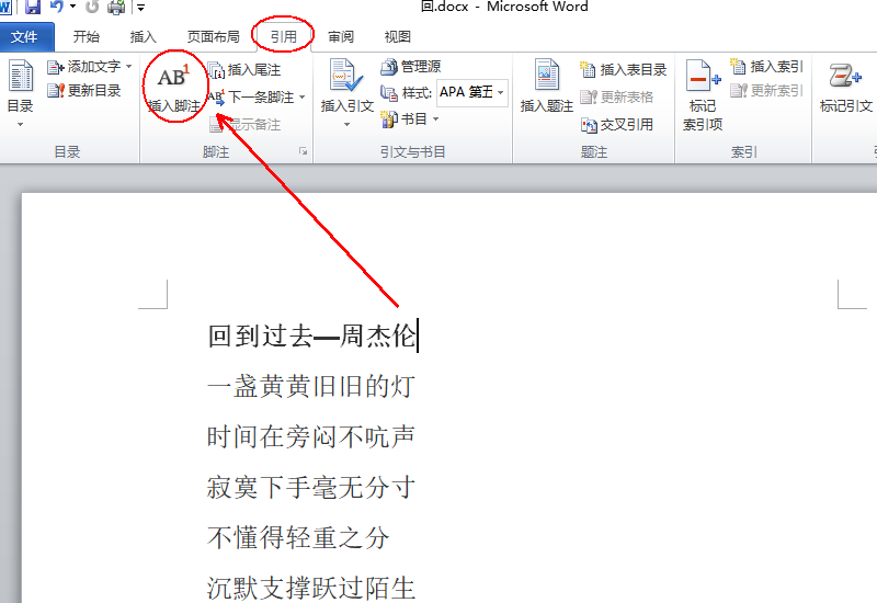 1、将光标放在要插入的文本后面,选择【引用】-【插入脚注】。