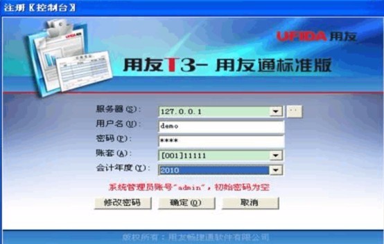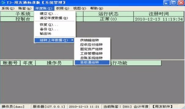 第二步:用demo身份进入,选择需要年结的账套,2010年日期。