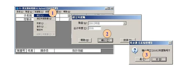 选择菜单栏的年度帐标签,在下拉菜单中选择建立,例如下图