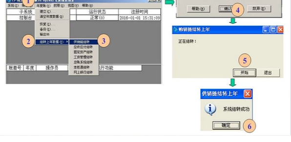 会计主管 进入系统管理 年度帐 建立 重新进入 用新年度 进入系统管理 年度帐 结转上年数据