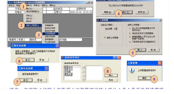 4、点击“年度帐”——“结转上年数据”——“工资管理结转”——“确认”——“是”——“是否选择清零项”——“选择清零项目”——“结束”。