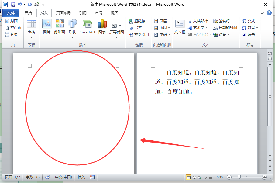 1、以Word2010版本为例,如下图所示,这两页间是没有空白页的,现要在这两页间插入空白页;