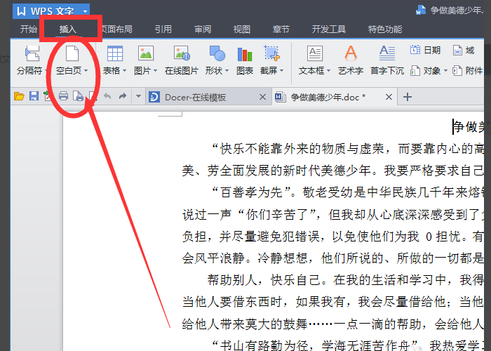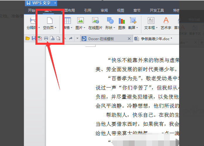 3、将光标移动到需要添加空白页的地方,单击左键,点击”插入“,点击空白页完成。