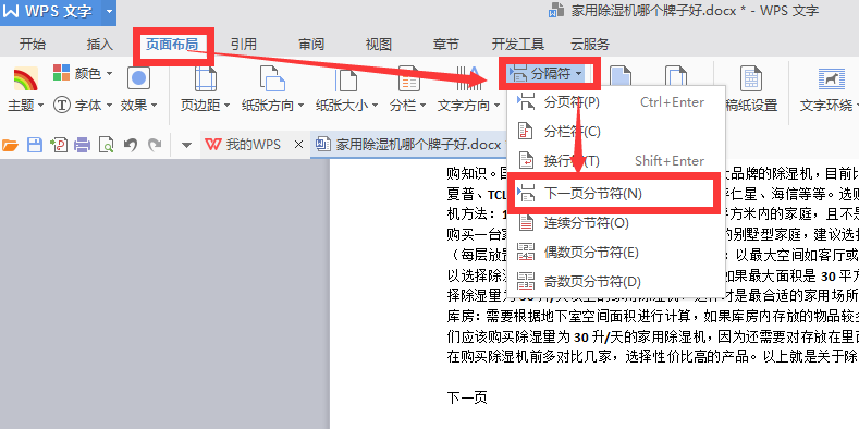 2、点击上方布局选项,点击分隔符中的”下一页“完成。