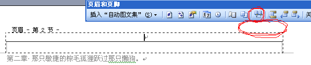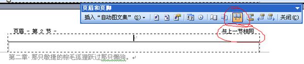 光标移到第二章,这时可以看到第二章的页眉和第一章是相同的,鼠标双击页眉Word会弹出页眉页脚工具栏,工具栏上有一个“同前”按钮(图像按钮,不是文字),