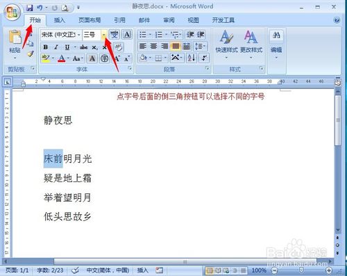 2、选择开始选项卡,在字号输入框中输入所需要的磅值并回车即可。