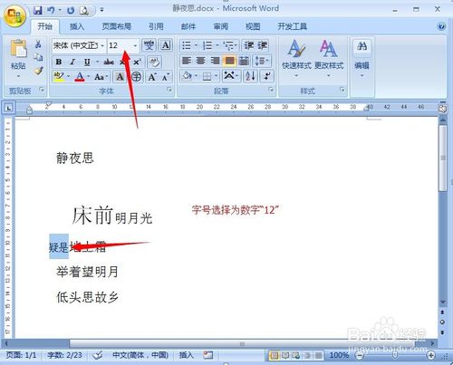 4、在字体选择框旁的字体大小选框内点击鼠标,则字体的号数会变成灰底。