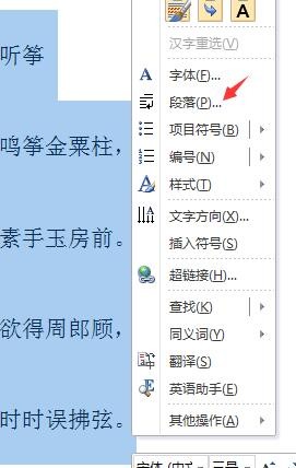 1、进入word2010,打开要设置的文档,选择上下距离很大的文字内容,右击鼠标,选择“段落”,如图: