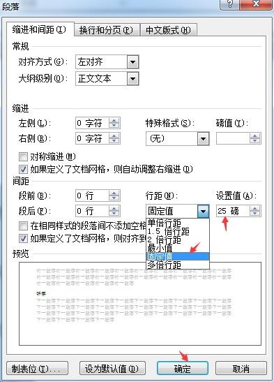 2、在“行距”中选择单倍或其他行距,也可以通过“固定值”来设置行距,当选择固定值时在设置值后面输入合适的值并按”确定“按钮,如图: