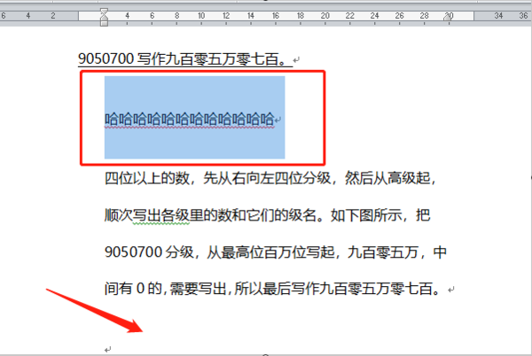 1、如下图,要把该文档里的哈哈哈这段文字移到下一段文字的后面,首选全选要移动的所有文字;