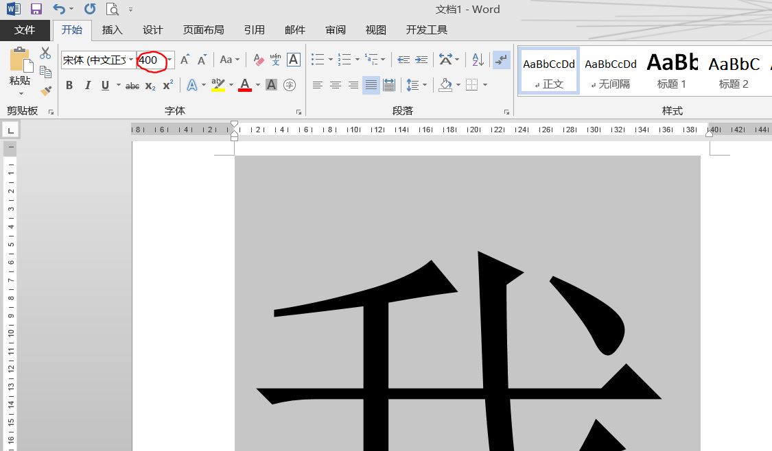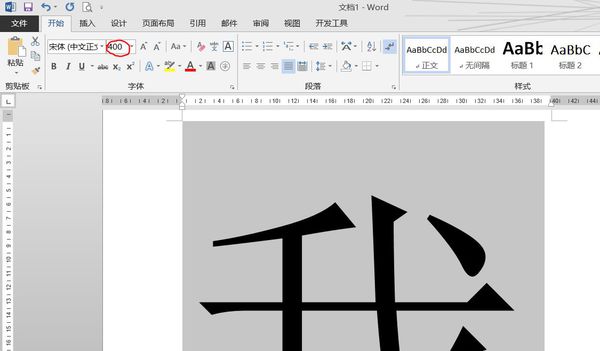 选择需要设置的文字,在“字体”中“字号”框中,直接输入350-400,回车即可使字充满整个页面。
