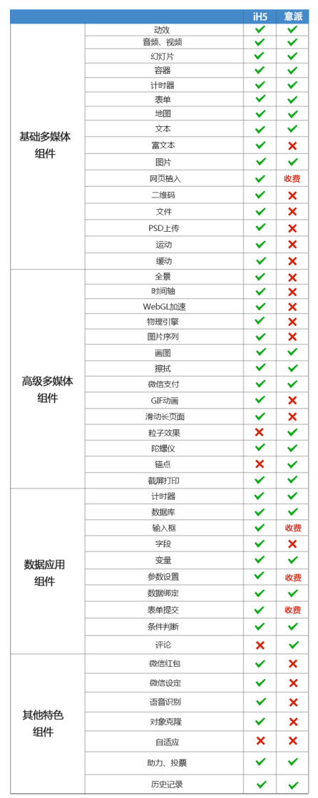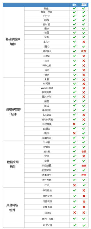 按市面上H5在多媒体范畴的应用,摘取常用于H5设计的功能,以此作为凭据,对比两个H5页面制作软件的功能覆盖度——