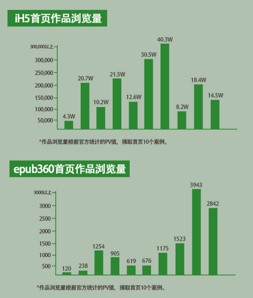前者反应网站有多少人浏览,即网站热度,观察网站首页的可视化数据可得;后者反应H5作品的有效数据统计,观察每个H5作品后台的数据统计结果可得。iH5跟Equb360在这两个维度上的对比尤为明显——