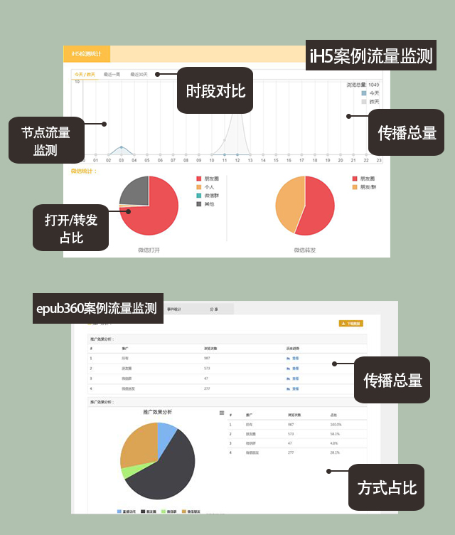 Equb360的数据统计较粗略,只有数据总量。虽然在后台设有专门的“推广分析”栏目,但只统计了朋友圈、微信群、好友这三种H5传播方式的数据,统计效果是相形见绌的。