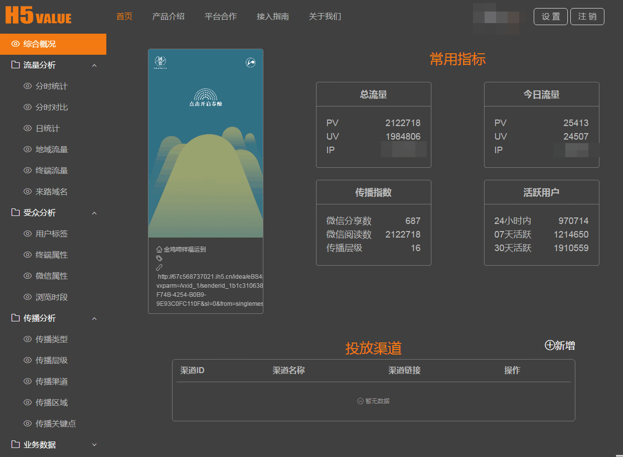 iH5的数据监测更精准,以每小时为单位监测。除了浏览量总量、各打开/转发方式占比,还涵括今日/昨日、最近一周、最近30天的数据对比。除此之外,iH5还向企业用户开放精准数据统计后台——H5VALUE,为单个案例分析地域流量、终端流量、浏览时段、传播指数、活跃用户量等细分化指标,也支持多个案例对比,在精细化数据面前,刷量原形毕露,剩下的只有真材实料的推广效果。