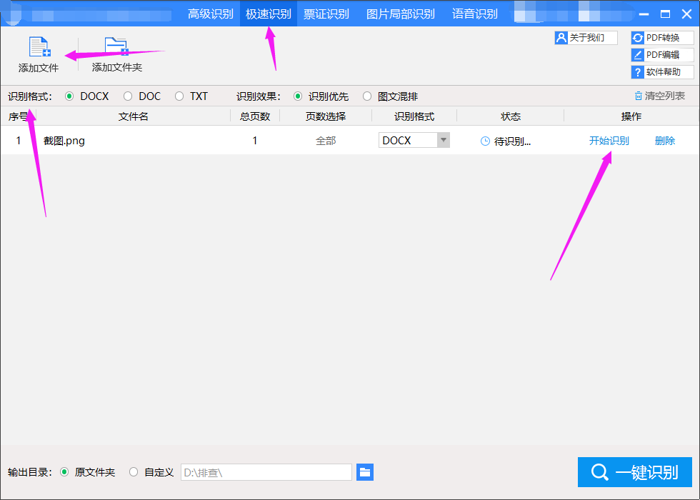 首先,打开ocr,选择上面的“极速识别”;接着,在左上角把需要识别的图片添加进去;然后,在上面选择文件的识别格式;最后,点击“开始识别”按钮。