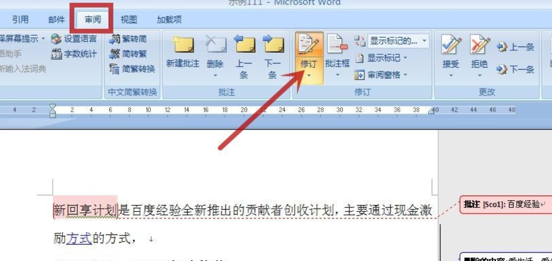 1、打开一个处于修订状态的文档,可见右侧有相关的修改内容及批注,见图中红框。