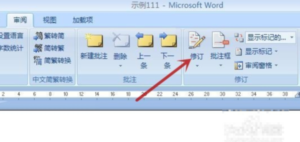 2、用鼠标左键单击顶端的“审阅”选项卡,可见“修订”命令是处于高亮状态,表示当前处于修订状态。
