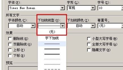 3、还可以用另一个快捷键;在打开的文档中用ctrl+D,会出现一个对话框,字体下有一个所有文字选项,下划线线型,可以点击任何线型,如果不要下划线,则选无就可以了。