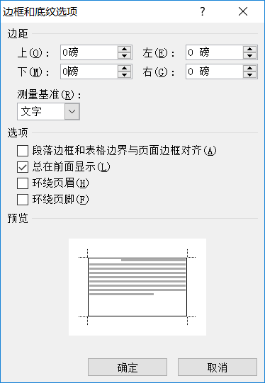 第二步,然后点选项,把边框设置在文字周围【默认是设置在页面边距距离】,就是那个测量基准,设为文字,把左右边距及上下边距设置为0,即最终结果外框与页边距相同。点确定,就把所有的文字设置成了带边框的。