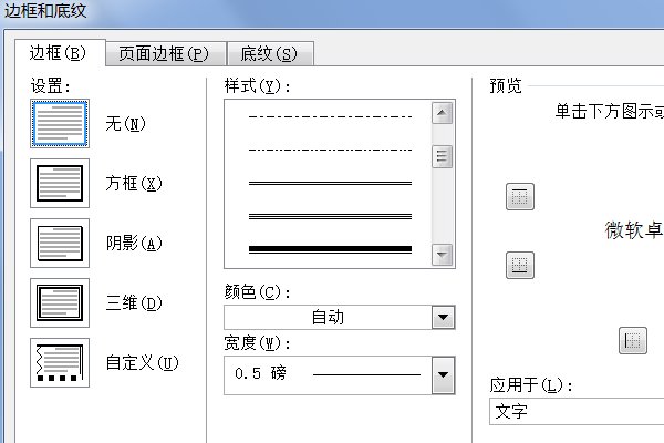 3、最后在“边框和底纹”中,任意选择一条下划线和颜色。设置成功。