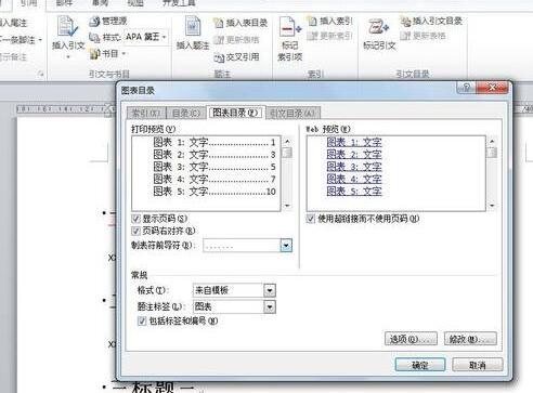 步骤十:点击“引用”,点击“插入表目录”,弹出图表目录的对话框,点击“确定”即可在选中的位置自动生成图表目录。