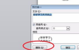 5、如果要删除的话,点“开始”里的“中文版式”图标,打开“双行合一”对话框,点左下角的“删除”即可。