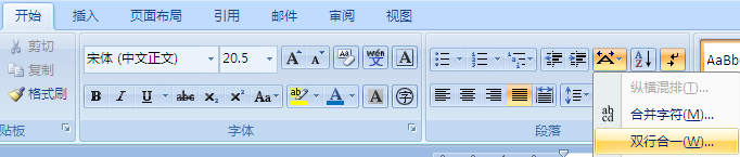 开始----段落---点有一个大写A然后左右上角各有一个向左右的箭头的图标,就会弹出对话框,选要双行合一的就行了。