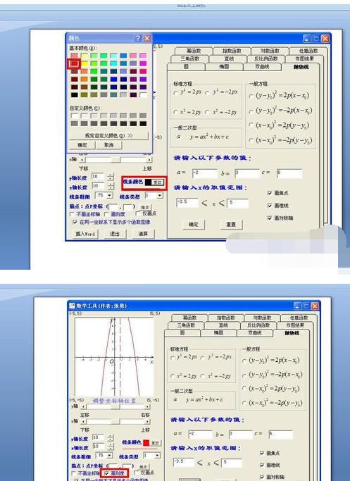 2.单击“函数图像”按钮,弹出对话框,单击“抛物线”按钮,下面有标准方程和一般二次型方程,选择一种(这里选择一般二次型方程)。