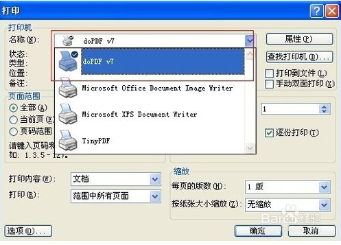 2:在打印机选项栏中选择doPDF v7,属性中可做相应的设置,这里不做描述;
