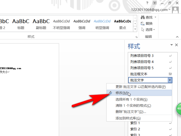 7、这时在点击样式工具栏中的批注文字,然后选中之后鼠标右击,选择修改选项。