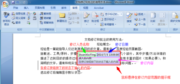 将鼠标指针移到文档中插入的文本上,或移到文档页边空白处删除文本批注框上。对于每处修订,您将看到一个屏幕提示,列出审阅者的姓名以及修订的类型,如“删除的内容”或“插入的内容”。屏幕提示还显示删除或插入的文本。
