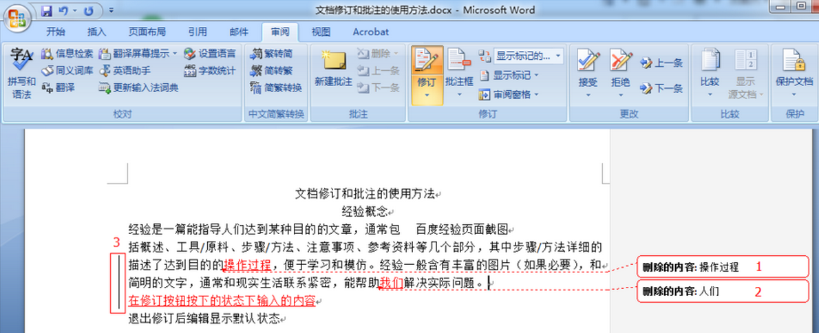 当您删除文本“操作过程”时,删除的文本被放在文档页边空白处的批注框中。它在批注框中显示“删除的内容”以明确文本为什么在批注框中。从删除文本的位置到批注框之间有一条虚线,以便每个人都可以看见删除文本的位置。