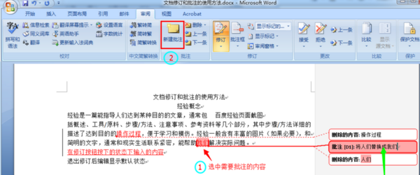 插入批注:在系统本身提供的修订提示区域不能完全表示我们修改文档的目的下,我们需要插入批注进行详细描述我们修改的目的以及修改文档的原因,此时可以插入批注进行文字描述。