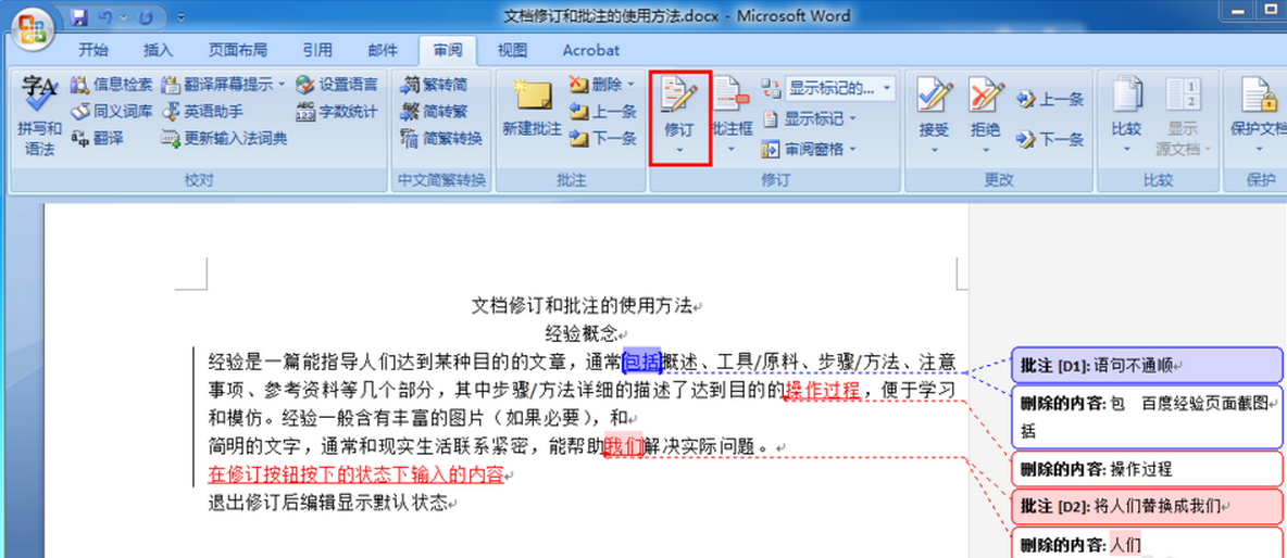 当有修订时,有人必须审阅然后接受或拒绝修订。审阅者可以一次处理一处修订或同时处理所有修订,并可以阅读批注然后删除。