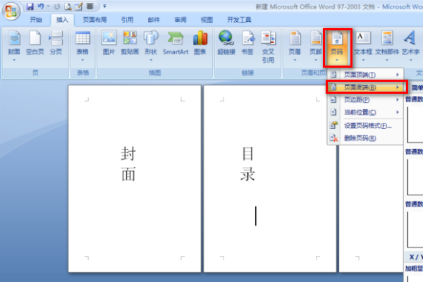 3、跳出下拉菜单,我们选择“页面底端”,再根据喜好选择一款页面形式。